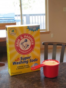 I also make my own laundry soap, but I make a powder. (Because I am too lazy to do something that actually requires heating and stirring and such.) I use the same three ingredients you do, though. I put the bar of fels-naptha in my food processor and grind it as close to powder as possible. Then I mix in a 1/2 cup of the washing soda and a 1/2 cup of borax for every bar. I store the whole thing in a big jug that used to hold pretzel rods from Sam’s Club. Two tablespoons per washload makes this a cheap alternative, and I’ve never needed fabric softener since I started using this recipe.