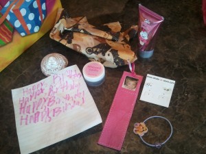Turns out Daisy Mae is a bit of a “re-gifter.”  She gave me her strawberry lotion and lip balm that she received from her friend.  She gave me a bookmark somebody gave me about 5 years ago and a few other knick knacks she found around the house.