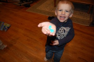 1) When the boy was 2 1/2, he was obsessed with me wearing this one pair of blue earrings. Every day, he would run upstairs to my dresser and hide the earrings in his pocket.
