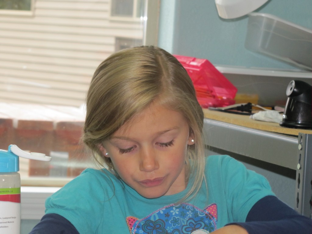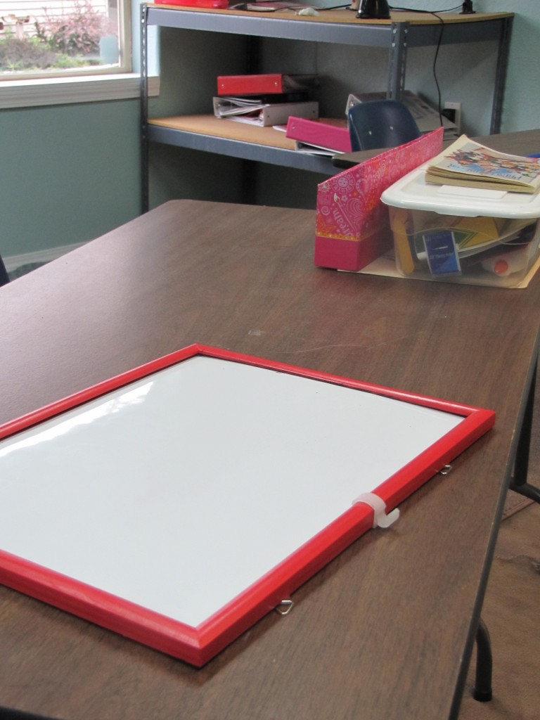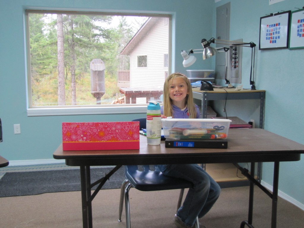 The girls each have their own desk, complete with a white board, pencil box, and art box. The shelves in the back of the picture hold their notebooks and such.