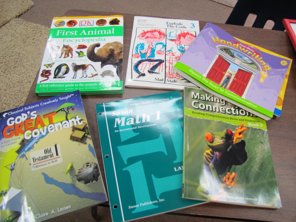 Explode the Code for Phonics, Saxon for Math, God’s Great Covenant for Bible, Zaner-Bloser for handwriting, and Making Connections is for reading comprehension.