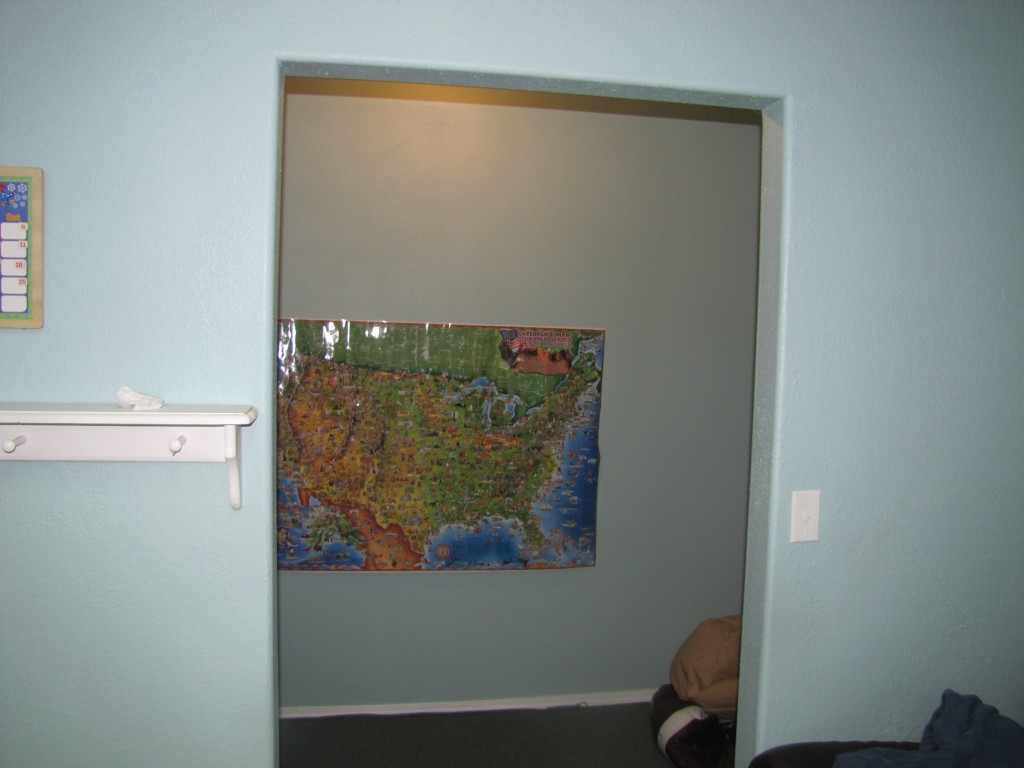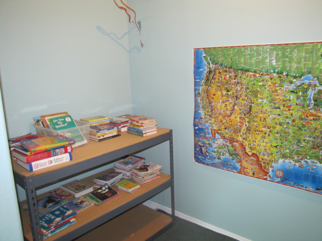Our school room is complete, but it is nothing spectacular like some of the school rooms I have seen online. All we did to it was paint the walls blue (holla!). The previous owners left several different throw rugs, tables, shelves, and lamps of which we were able to use for the school room.